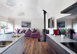 Cuisine Ouverte Sur Salon Et Salle A Manger En Noir Et Blanc Avec Poele A Bois Cuisine Ouverte Sur Salon Amenagement Salon Salon Ouvert